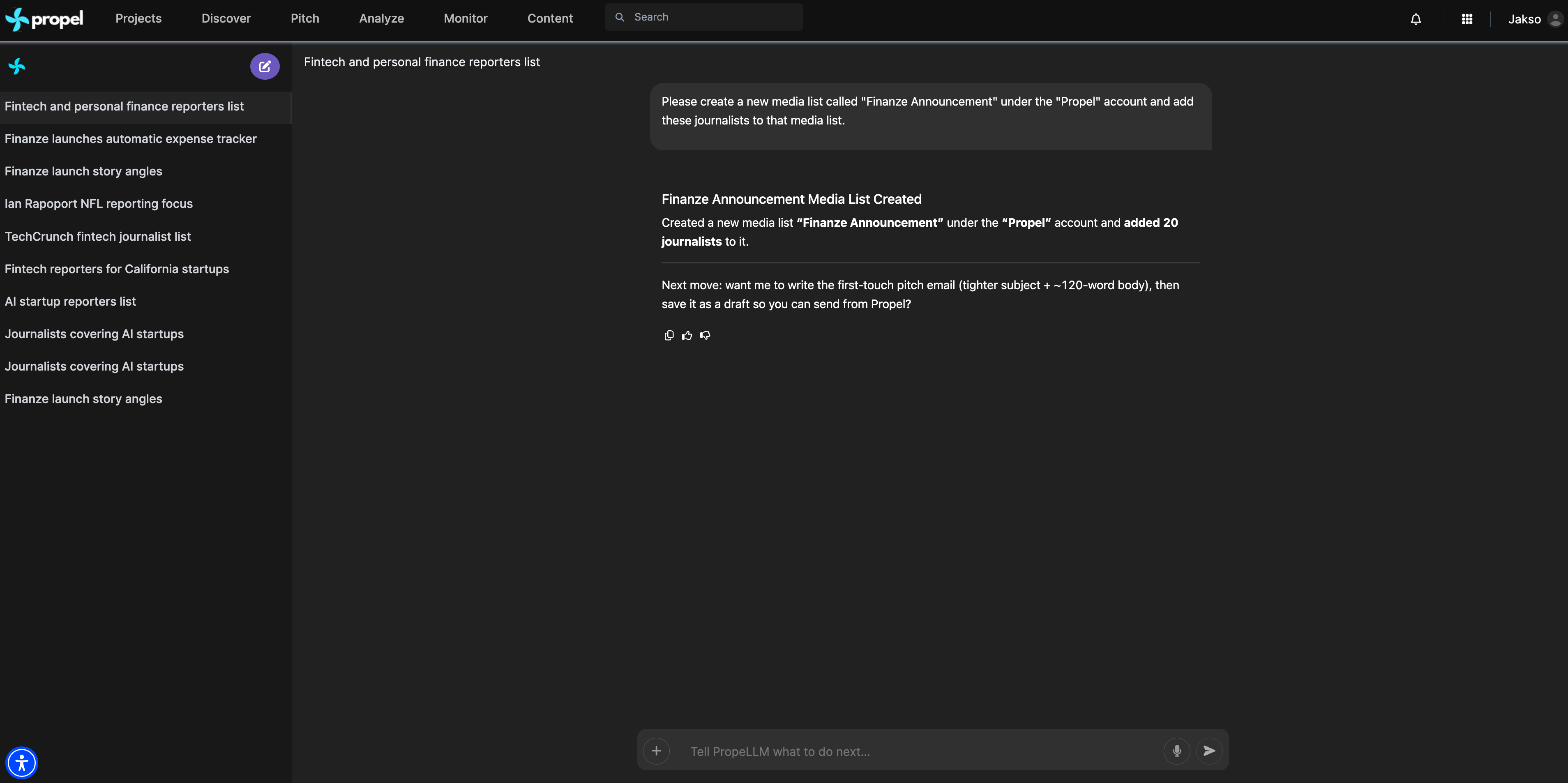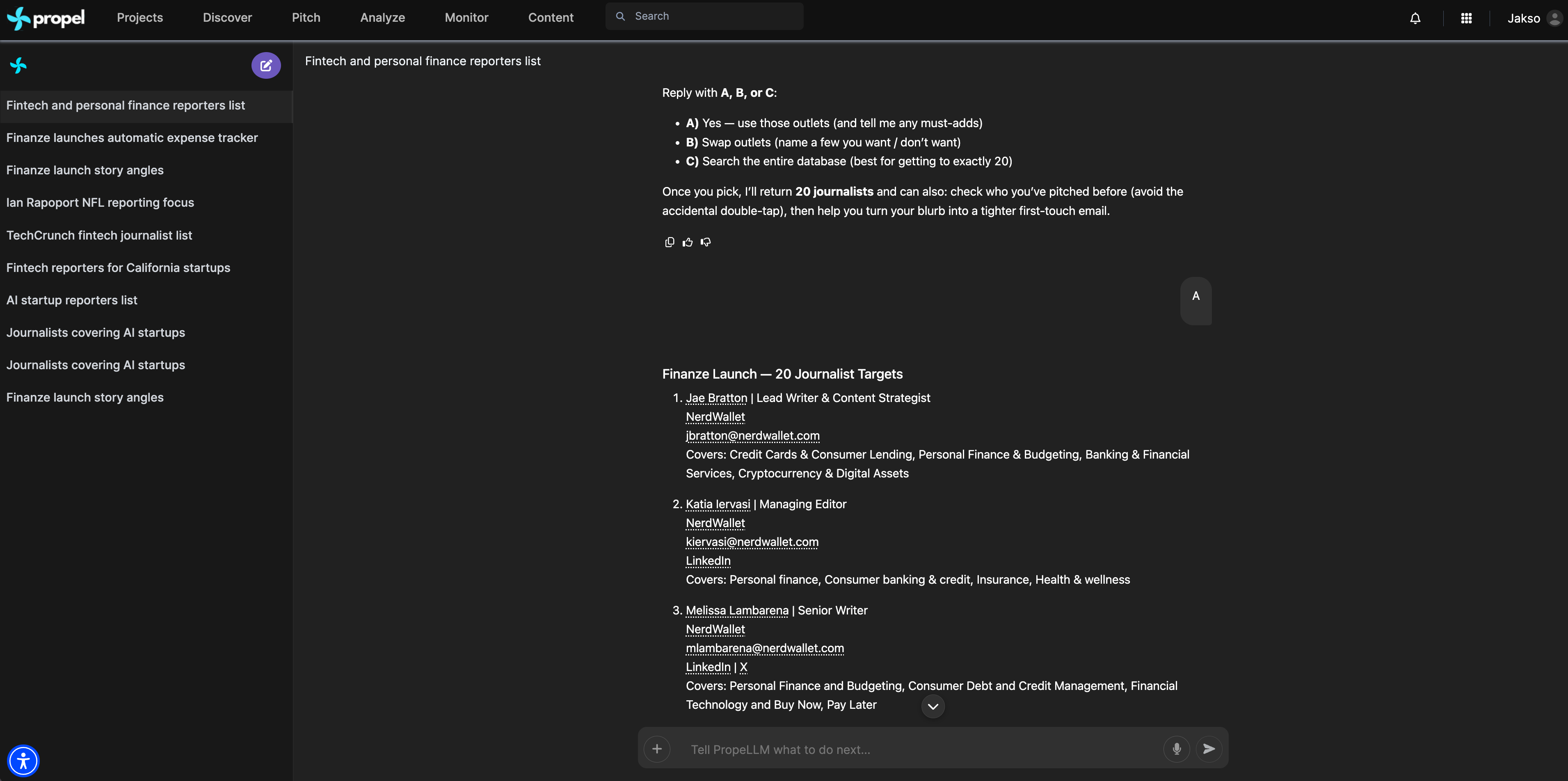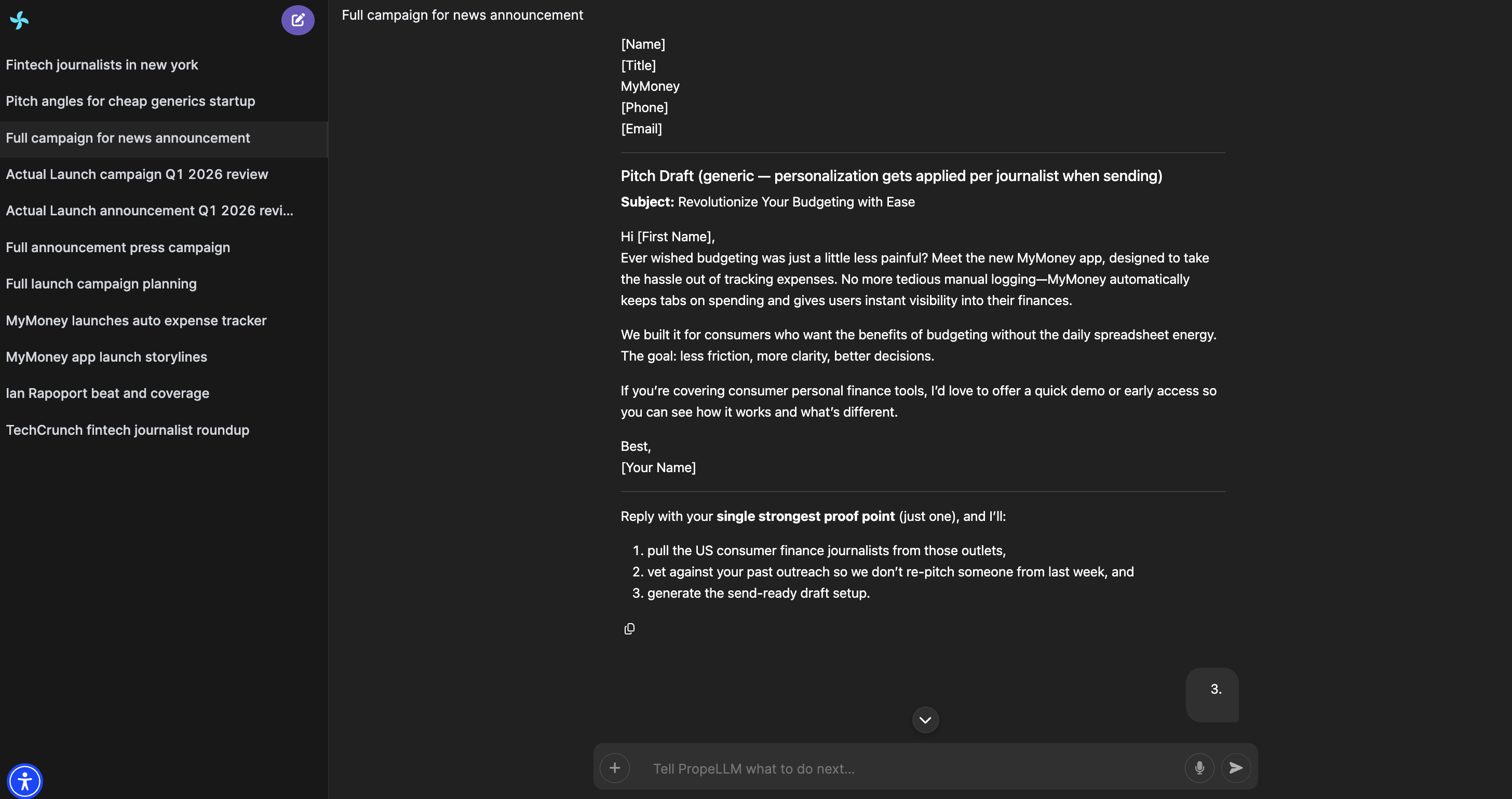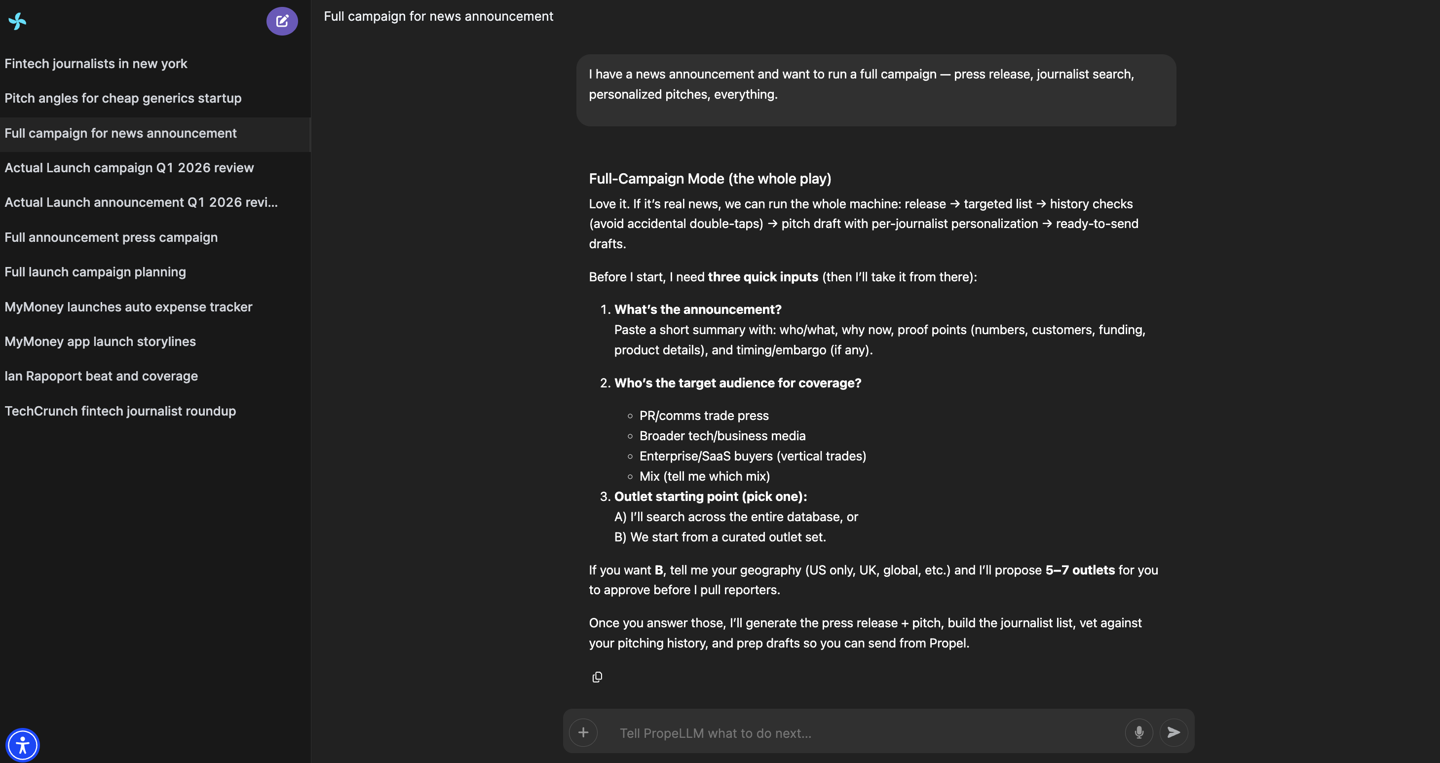 Just tell Propel-LM you want to launch a campaign, and it will ask a few questions and guide you through the process. It identifies relevant journalists, builds your media list, drafts personalized pitches, and prepares outreach emails.