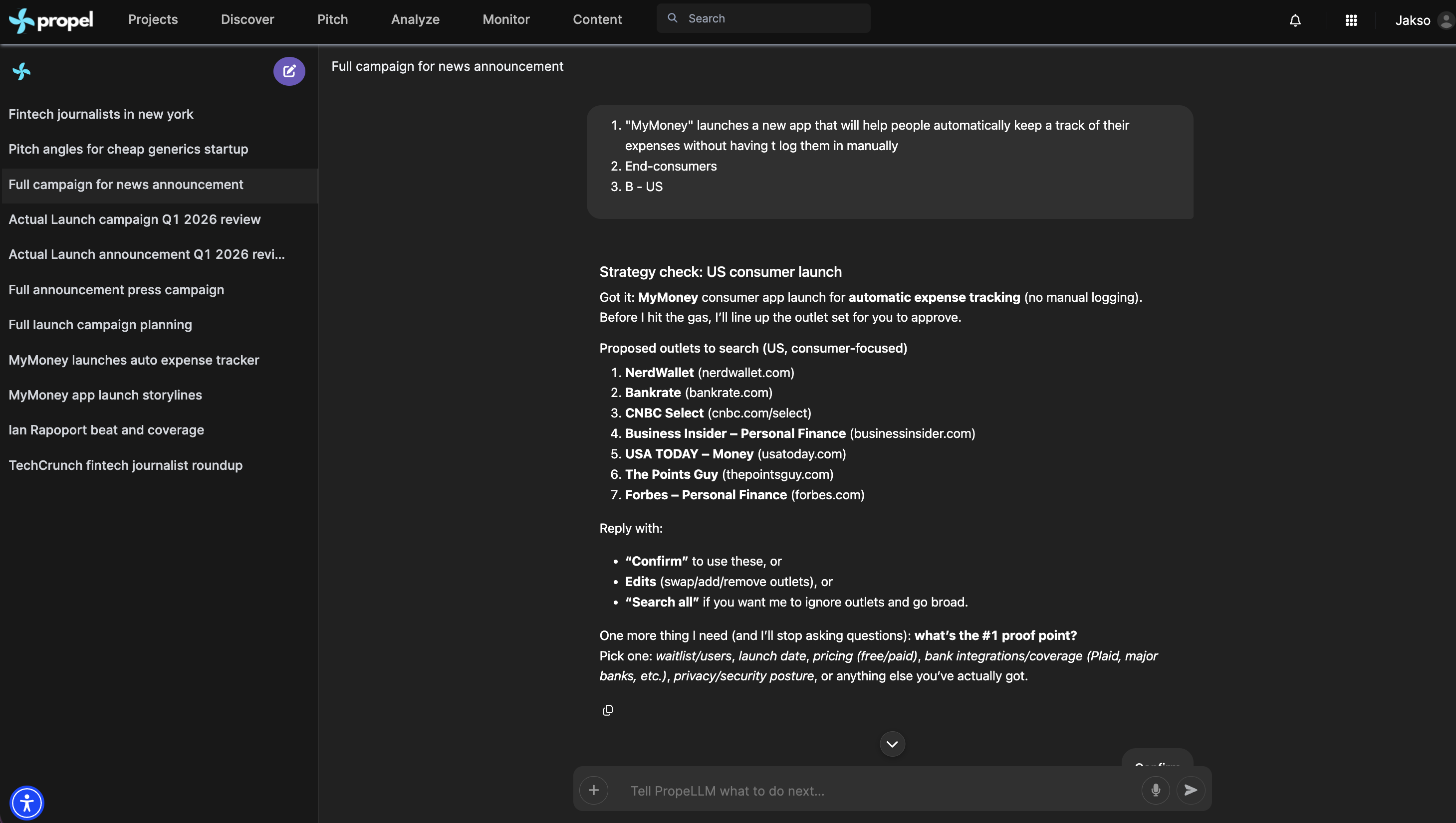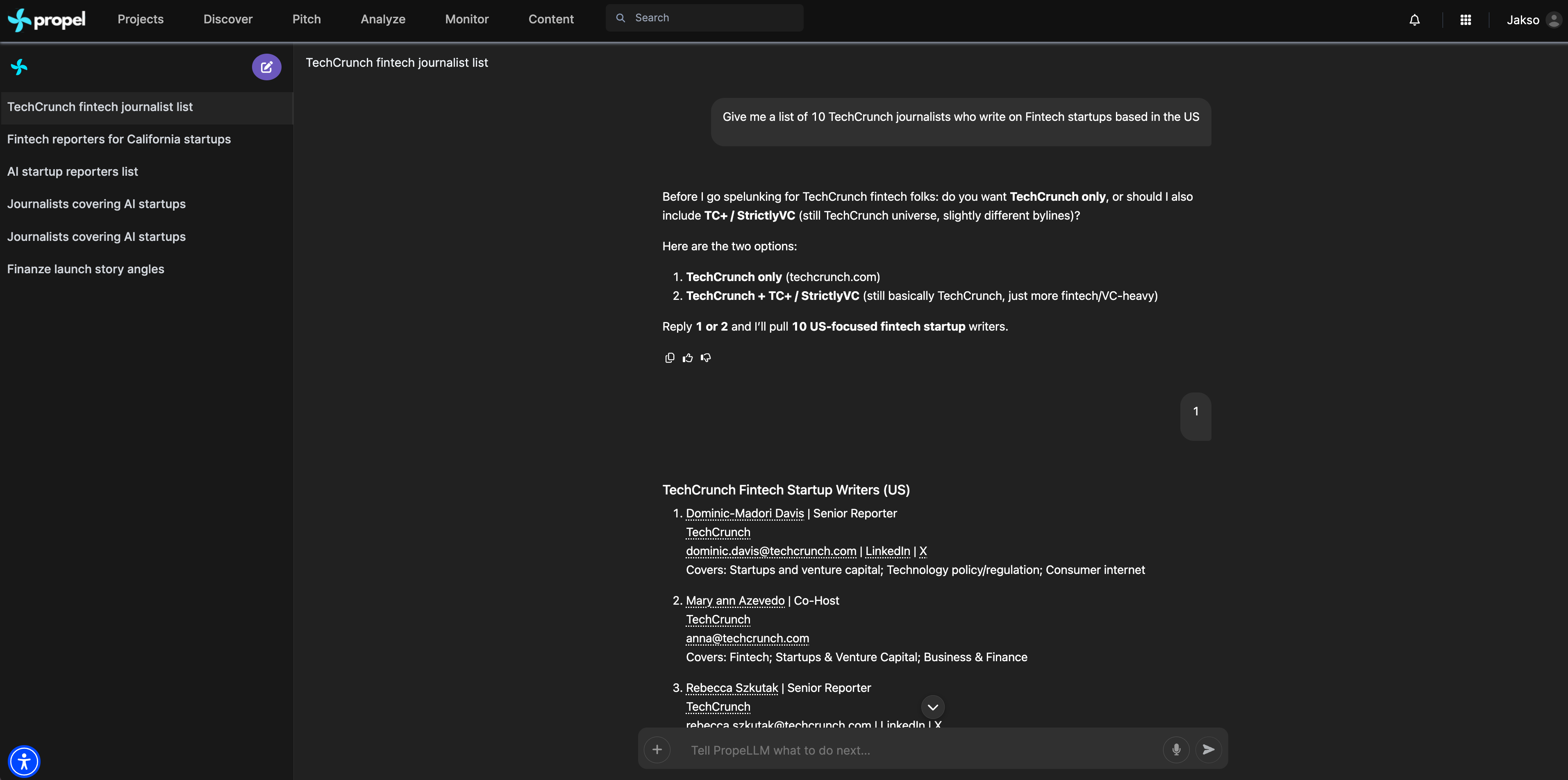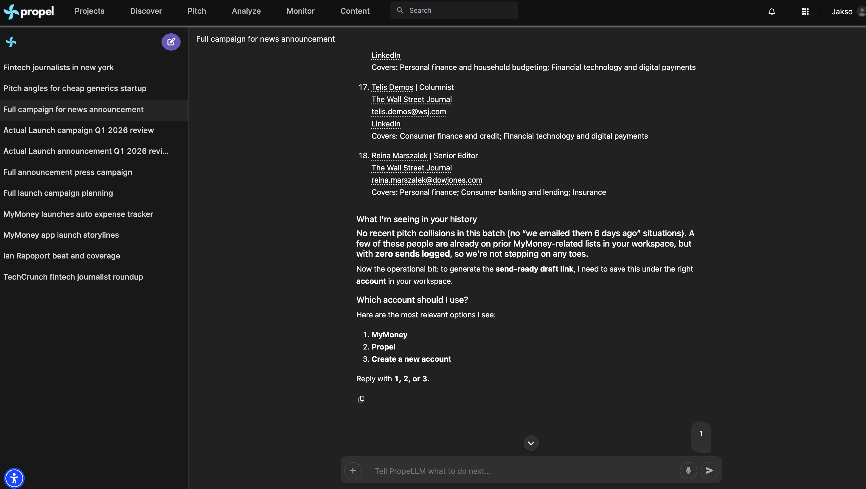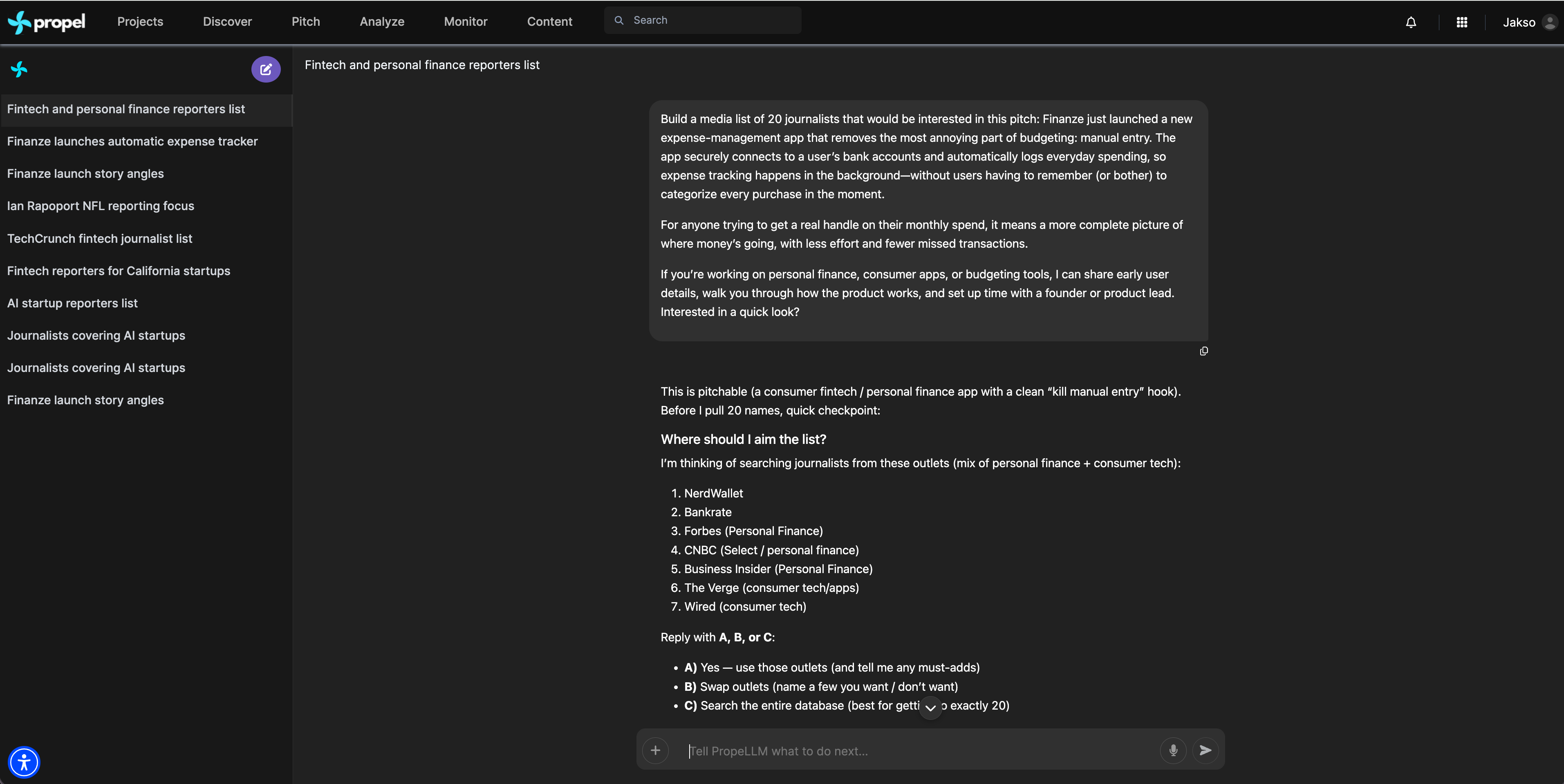 Just tell Propel-LM you want to launch a campaign, and it will ask a few questions and guide you through the process. It identifies relevant journalists, builds your media list, drafts personalized pitches, and prepares outreach emails.