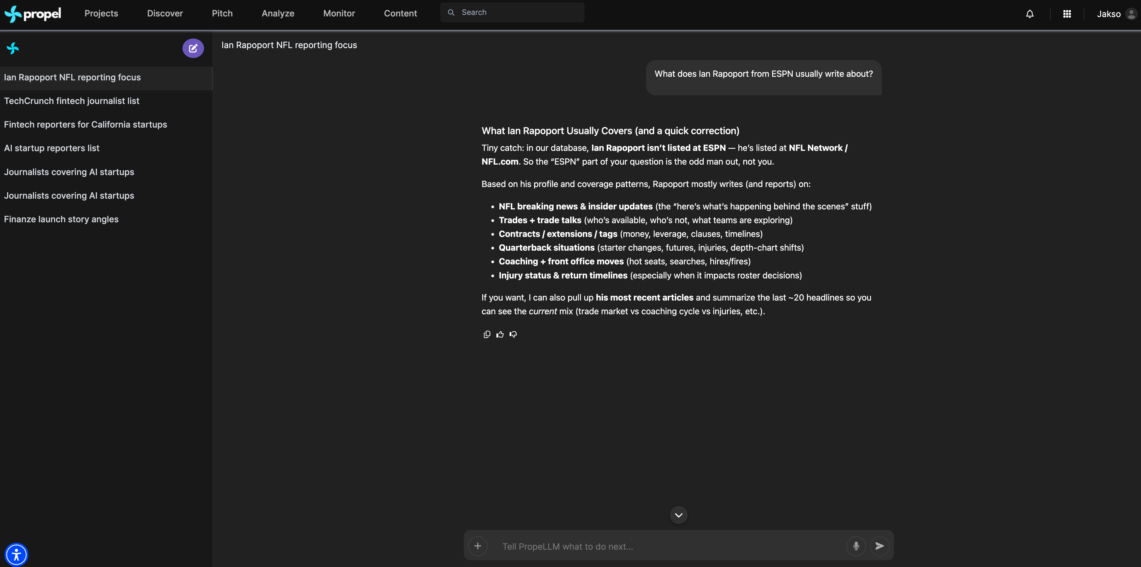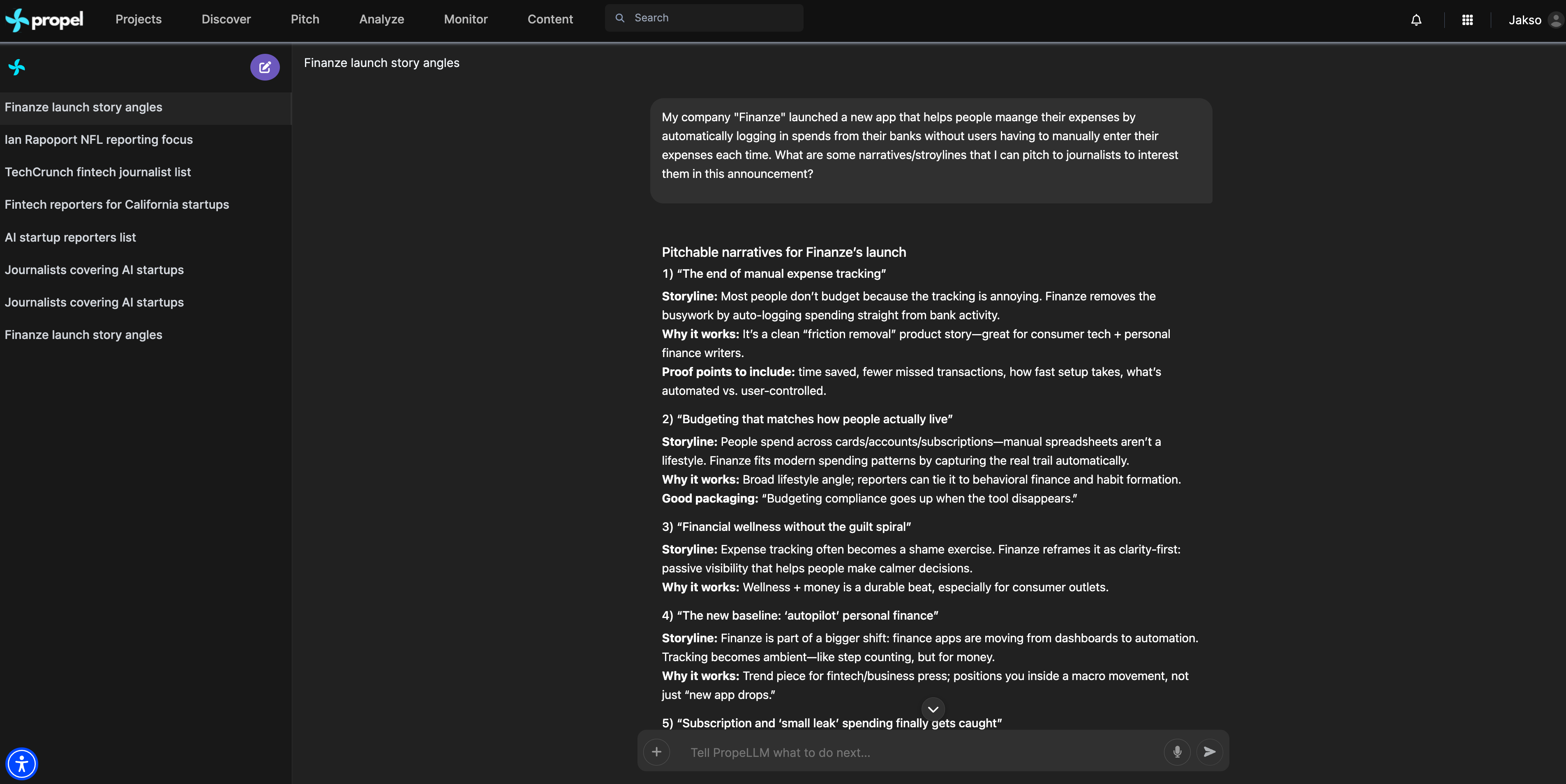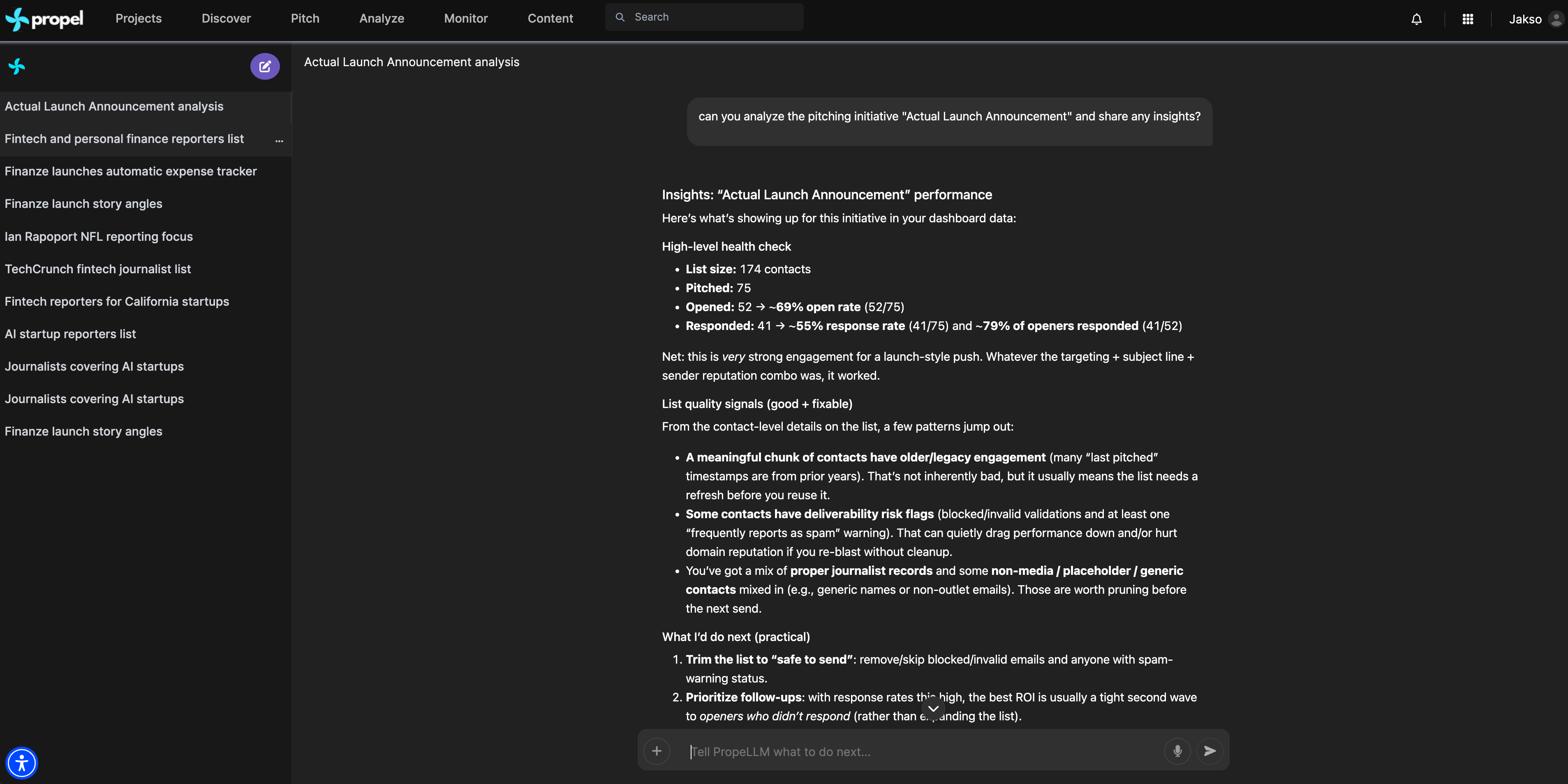 PropeLLM is an AI-powered PR assistant built directly into the Propel platform. It helps communications teams discover journalists, develop story angles, draft pitches, manage media lists, and analyze campaign performance, all in one unified workflow.