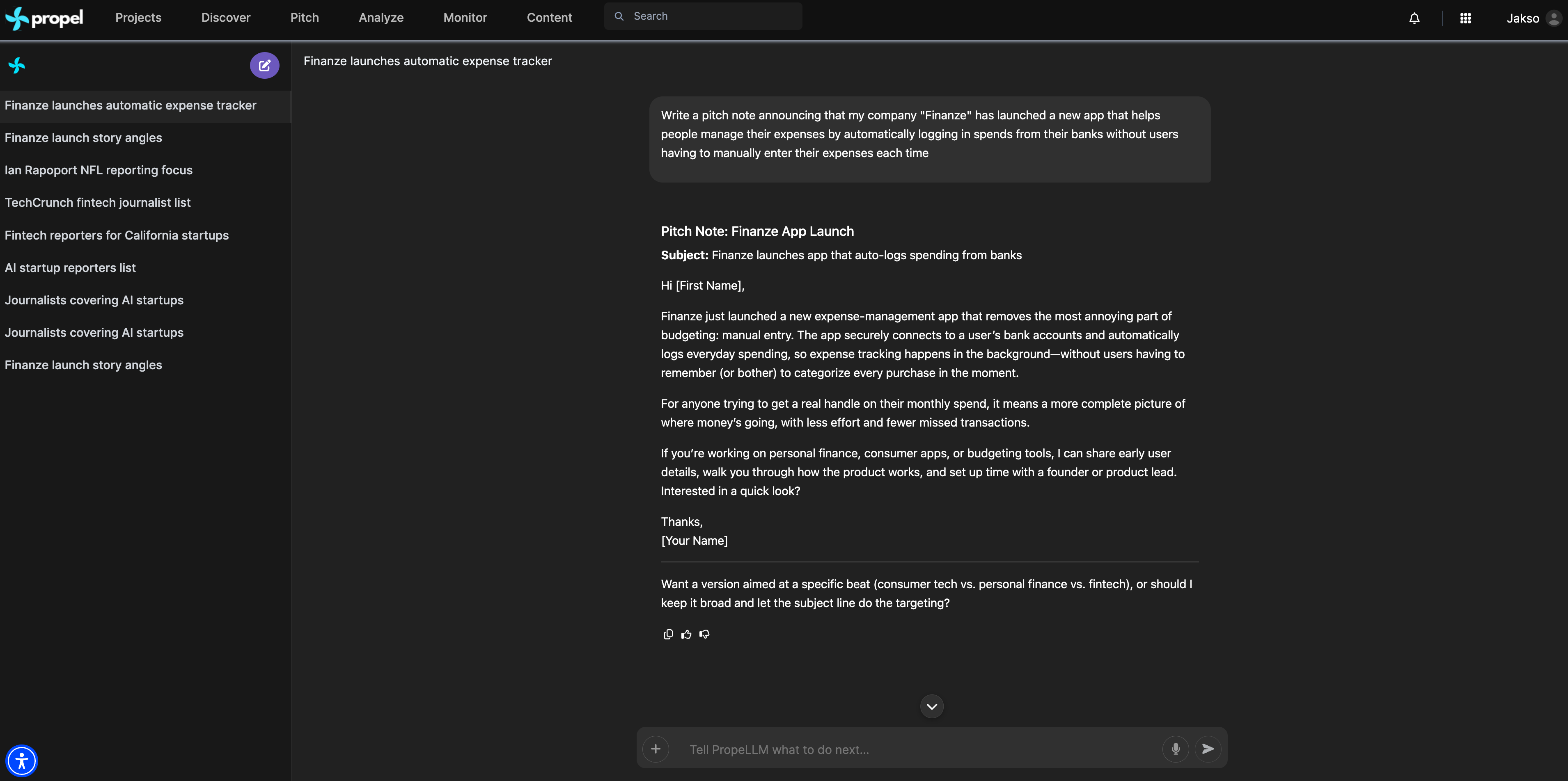 PropeLLM streamlines the entire pitching workflow, from idea to ready-to-send draft. Once your pitch is generated, the Agent provides a direct link that opens your email in Propel with drafts already populated, making it fast and seamless to go from ...